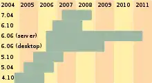 | 6.06 LTS | 1. juni 2006[35][36] | Dapper Drake | Flight | Juni, 2009 (hjemmecomputere); Juni, 2011 (servere) | LiveCD og Installationsprogram på én cd, Ubiquity installationsprogram. Første Long-Term Support-udgivelse. |