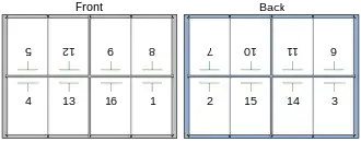 Udskydningsplan for et trykark med 16 sider så siderne placeres korrekt ved foldning (falsning)