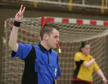 Når en spiller får en udvisning, er han/hun udvist i to minutter. Når de to minutter er gået, må spilleren gå ind på banen igen, medmindre det var spillerens tredje 2-minuttersudvisning i samme kamp. Tredje gang en spiller tildeles en 2-minuttersudvisning, veksles den nemlig til et rødt kort. Når spilleren får et rødt kort, skal han/hun forlade banen og gå enten i omklædningsrummet eller op på tilskuerpladserne. Dette kaldes en diskvalifikation. Dommertegnet for en udvisning er et "omvendt V-tegn" (se billedet), hvor forsiden af fingrene vendes mod spilleren.