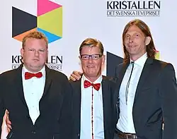 ![]() Morgan Karlsson, Boris Lennerhov og Ola-Conny Wallgren fra tv-serien ved Kristallen-gallaen 30. august 2013 | |