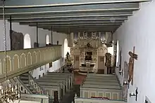 I det inde har kirken fladt bjælkeloft. 1673 blev kirken malet i barokkstil med scener fra Jesu Liv og fremstillinger af de danske konger. Grantidøbefonten med fire løvehoveder er fra omkring 1200. Blandt interiøret kan desuden nævnes et gotisk krucifiks fra 1230/40 samt et triumfkors fra begyndelsen af 1500-tallet. Figurgruppen med Sankt Jørgen (Sankt Georg) og en mytologisk drage som enhjørning er fra ligeledes fra før-reformatisk tid. Den nuværende altertavle fra 1803 er udført i klassicistisk stil. Barokkalteret fra 1700-tallet er desværre ikke bevaret. Efter at dåbsenglen fra 1787 med dåbsfadet i hænderne blev flyttet til præstegården, blev kirkens knæfald forsynet med en foldbar træskål som lille dobsfont. Pulpituret i kirkens vestlige del er fra 1600-tallet, nordpulpituret er fra 1784/85. Det første orgel blev indbygget senest i 1682. Det nuværende orgel er fra 1787, det gamle orgel blev samme år overført til Brodersby Kirke.
