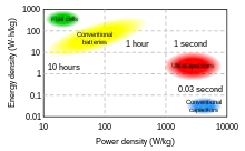 - Energimængden gemt per enhed masse er betydeligt lavere end et konventionelt kemisk batteri (3-5 Wh/kg for hidtidige superkondensatorer sammenlignet med 30-40 Wh/kg for et batteri).