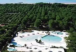 Badelandet er det ældste af campingpladsens to, men moderniseret løbende. Det består af fem bassiner, der alle er opvarmede, hvoraf det ene er med halvolympiske mål (25 x 12,5 meter)[7]. Et af bassinerne er desuden med vandstrøm, således at man kan flyde rundt i den på en badering.