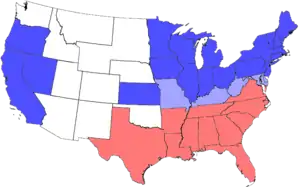Unionsstaterne var: California, Connecticut, Delaware*, Illinois, Indiana, Iowa, Kansas, Kentucky*, Maine, Maryland*, Massachusetts, Michigan, Minnesota, Missouri*, Nevada, New Hampshire, New Jersey, New York, Ohio, Oregon, Pennsylvania, Rhode Island, Vermont, West Virginia*, Wisconsin (* angiver at der var tale om en grænsestat).