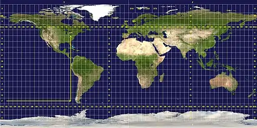 Hver gitterfirkant er refereret til af længdezonens nummer og breddezonens bogstav. Længdezonen skrives altid først, efterfulgt af breddezonen. For eksempel (se billede af Europa), vil en position i København, Danmark , befinde sig i længdezone 33 og breddezone "U", derfor er den fulde reference "33U".