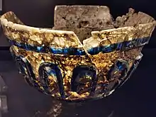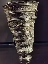 Sammen med glasskålen fandt man ligeledes et bæger af kobber og sølv i templet. På ydersiden er bægeret dekoreret med bånd af guldblik med motiver af dyr og mennesker. Bægeret er ligeledes en pragtgenstand til ceremoniel brug. Bægeret ser ikke ud til at være importeret, men er af skandinavisk oprindelse og kan muligvis være fremstillet i Uppåkra. Glasskålen og bægeret blev fundet nedgravet ved siden af ildstedet i kulthuset. Årsagen er ukendt, men en teori er, at det kan være et gemmested for skattene under en plyndring af Uppåkra eller være begravet af ceremonielle årsager.