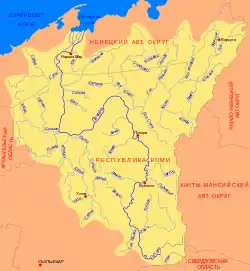 Største bifloder er, fra venstre: Lemva, Bolsjoj Kotjmes, Bolsjaja Rogovaja og Kosju, og fra højre: Vorkuta og Kolva.