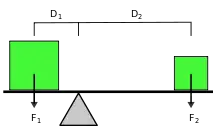 Figur 1. Statisk ligevægt. Vægtstangsprincippet er matematisk udledt af den specielle situation hvor F1D1 = F2D2.
