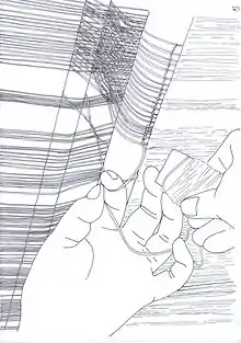 Gobelinens tegnede motiv er hæftet eller syet fast bag trenden. Væveren kan se motivet gennem de udspændte trendtråde. De forskellige farver islæt er viklet op om gobelinpinde, der hænger klar til brug på bagsiden.