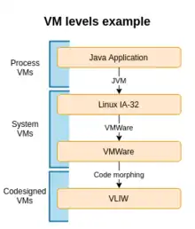 Eksempel på tre forskellige virtualiseringsteknologier stablet oven på hinanden.