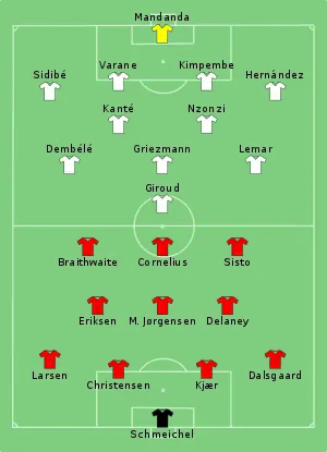 - "Tactical Line-up – Group C – Denmark v France" (PDF). FIFA.com. Fédération Internationale de Football Association. 26. juni 2018. Hentet 26. juni 2018.