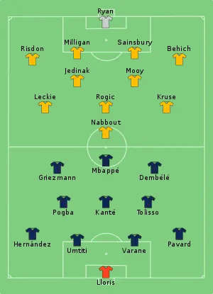 - "Tactical Line-up – Group C – France-Australia" (PDF). FIFA.com. Fédération Internationale de Football Association. 16. juni 2018. Arkiveret fra originalen (PDF) 16. juni 2018. Hentet 16. juni 2018.