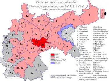 Fordelingen af vinderne i de ulige valgkredse (rødt=USPD, rosa=SPD, grå=Det katolske sentrumspartiet, blåt=DNVP)