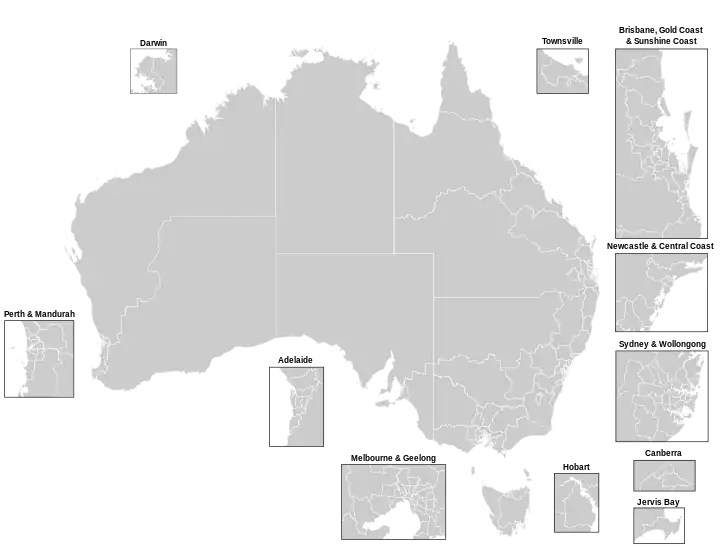 Kortene nedenfor viser valgkredsgrænserne, som de var fastlagt ved Australiens valg 2010.