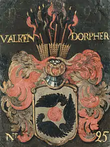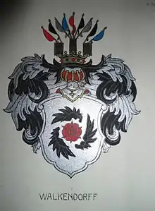En af tre sorte vinger omsat rød rose i sølv-felt, på hjelmen fem eller syv, vekselvis sølv- og røde faner, undertiden opstående af en skansekurv, eller også syv påfjer.