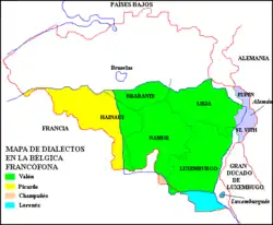 I Vallonien tales fire forskellige vallonske dialekter i fire adskilte zoner: Østvallonsk som tales i området omkring Liège, midtvallonsk som tales omkring Namur, vestvallonsk i zonen Nivelles-Charleroi-Chimay og sydvallonsk i Ardennerne.