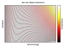så ligningen tager derved højde for partiklernes volumen. Det andet led giver derimod et større negativt bidrag til trykket, jo lavere volumenet bliver, hvilket også var mening. Pga. af de to modsatsrettede bidrag bliver isotermer mere komplekse end ved en idealgas. Det er endda muligt at opnå et volumen, hvor trykket stiger uafhængigt af, om gassen komprimeres eller ekspanderes.[1]