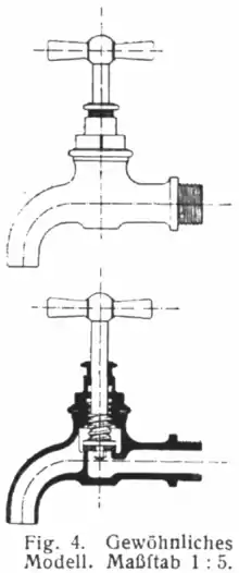 Ældre gennemskåret vandhane: Ved at dreje den lodrette pind kan vandgennemstrømningen reguleres