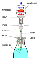 Man suger i slangen og skaber dermed et undertryk i luftkammeret. På den måde trækker man røgen fra hovedet, ned igennem glasset, og ud til mundstykket
