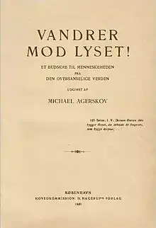 - 'Vandrer mod Lyset! - Et budskab til menneskeheden fra den oversanselige verden', udgivet af Michael Agerskov, H. Hagerups forlag 1920
