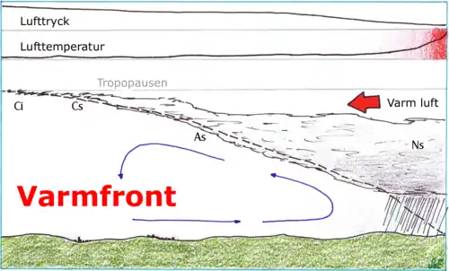 Varm luft er lettere end kold luft, fordi den har lavere tryk end den omgivende køligere luft. Den varme luft vil, fordi den er lettest, glide over det kolde luftlag. Derved dannes lette skyer der senere fortætter og danner nedbør. Når nedbøren falder som regn, er den ofte silende.