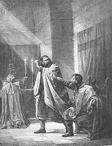- "Det hændte en søndag, at kong Olav sad til bords i højsædet og faldt i så dybe tanker, at han ikke sansede tiden. Han havde en kniv i hånden, holdt på en pind og skar nogen træsplinter af den. En mundskænk stod og holdt et bæger foran ham. Han så, hvad kongen gjorde, og fornemmede, han sad i andre tanker. Han sagde : «I morgen er det mandag, herre.» Kongen så på ham, da han hørte dette, og kom til at tænke på det, han havde gjort. Da bad kongen, at de skulle give ham et lys. Han samlede alle træsplinterne, han havde skåret, sammen i hånden. Så tændte han ild på dem i hånden og lod træsplinterne brænde. Af dette kan man fornemme, at han holdt loven og buddene nøje og ikke ville gøre andet, end det han vidste var ret.", Snorri Sturluson, Heimskringla