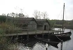 Elbslavisk bebyggelse med anløbsbro i egnsmuseet i Oldenburg in Holstein (ca. 7 - 800 tallet).