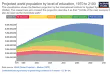 - Data fra 2015: ourworldindata.org: The short history of global living conditions and why it matters that we know it by Max Roser Citat: "...This visualization shows the projection of the IIASA demographers for the size and the educational composition of the world population until 2100. It is an interesting look into the future: With today’s lower global fertility the researchers expect that the number of children will decline from now – there will never be more children on the planet than today. And as mentioned before the IIASA researchers expect the world population to peak in 2070 and to decline thereafter. Focusing on the educational breakdown the projection suggests that by 2100, there will be almost no one without formal education and there will be more than 7 billion minds who will have received at least secondary education. With the great importance of education for improving health, increasing political freedom, and ending poverty this prospect is very encouraging...", backup fra 2019