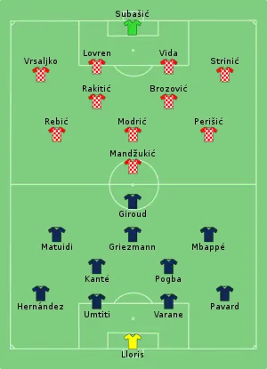 - "Start list – Final – France v Croatia" (PDF). FIFA.com. Fédération Internationale de Football Association. 15. juli 2018. Hentet 15. juli 2018.