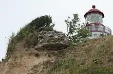 En akvarel af Magnus Petersen fra 1874 viser en murrest af munkesten, men julenat i 1875 styrtede denne i havet.[1]