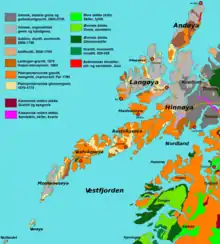 I Vesterålen findes både Norges ældste og yngste bjergarter. Bø har bjergarter, som er 3.500 mill. år gamle, mens man på Andøya kan finde bjergarter, som "kun" er mellem 130 og 180 mill. år gamle.