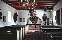 Skibet har fladt bjælkeloft, koret har fået indbygget hvælv i sengotisk tid, korbuen er udvidet. Den trefløjede altertavle dateres til omkring 1475, i midterskabet ses øverst Kristus flankeret af Sankt Gertrud og Sankt Dorothea samt Sankt Barbara og Sankt Hettelus, nederst ses Maria med barn i solgissel, hun flankeres af Maria Magdalene og Johannes Døberen samt Sankt Katarina og Sankt Archelaus, Sankt Archelaus og Sankt Etherus (Hettelus) er sjældent sete bispehelgener, i fløjene ses apostle. Over den nye prædikestol hænger en himmel fra 1739. Over korbuen hænger et sengotisk krucifiks. I kirken ses flere epitafier og gravsten over lokale gårdmænd og skippere.