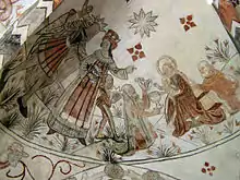 I korhvælvet ses kalkmalerier fra begyndelsen af 1500-tallet, de tillægges Sæby-værkstedet. Kalkmalerierne blev afdækket og restaureret i 1907-8, i 1953 blev de genrestaureret af H. Borre i 1983 af K. Simonsen. I østkappen ses Kongernes tilbedelse, som er hovedmotivet, i de øvrige tre hvælvkapper ses kongernes rejse. Kongerne har hver deres hvælvkappe, hvor de rider med et følge, der nærmest ligner et jagtselskab, på fanerne står kongernes navne. I nordkappen ses Casper med sit følge, forrest rider en nar, som bruger en råber, han er skaldet og under koften ses hans bare ende. Bag Casper ses en rytter, som rider direkte mod beskueren, en dristig forkortning på denne tid. I sviklerne ses en skytte, som sigter på en hjort i den modstillede svikkel. I sviklerne ses desuden en galge med en ræv, en klokkestabel med klokke og klokkereb, en tranehals og vrængmasker samt en gris klædt ud som soldat, meget lig grisen i Nibe Kirke, hvor Sæby-værkstedet også har arbejdet. Billedet har været baggrund for en rekonstrueret klokkestabel på frilandsmuseet Middelaldercentret ved Nykøbing Falster, som også har fremstillet en rekonstrueret klokke til at hænge i klokkestablen.[1]