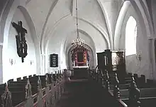 Kirken fik indbygget krydshvælv omkring 1500, korbuen blev formodentlig omsat til spidsbue ved samme lejlighed. Alterbordet dækkes af et renæssancepanel. Altertavlen i barok er fra omkring 1700; i midterfeltet er indsat en gammel tavle med nadverordene. Det oprindelige midterfelt fra omkring 1700 er nu ophængt i koret; på billedet ses Jesus med tolderen og farisæeren. Et tilsvarende maleri findes i Ingstrup kirke. Altertavlen har desuden haft to andre malerier i midterfeltet, det ene er en kopi efter Bloch, begge er nu ophængt i tårnrummet. På skibets nordvæg er ophængt et korbuekrucifiks fra omkring 1500, på det afkvistede korstræ er der forneden svajede sidegrene, som bærer figurer af Jomfru Maria og Johannes. Prædikestolen i renæssance er fra omkring 1600. I felterne ses relieffer fra Jesus historie, desuden ses navnene præst Jens Jørgensen og hans forældre sognepræst Jørgen Jensen og hustru. Ved tårnbuen står en Mariafigur.