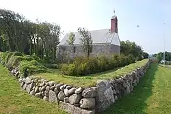 Kirkegården er omgivet af et gammelt kampstendige, som mod vest har to låger. Den sydligste af dem er flankeret af to 2 meter høje stolper