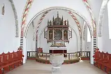 Prædikestolen er fra 1625 og fremstår med reliefferne: Bebudelsen, hyrdernes tilbedelse, omskærelsen og Jesu dåb i Jordan.
