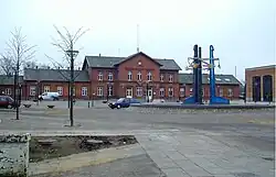 Stationsbygningen set fra gangbroen over sporene (2019).