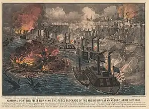 Den 16. april, en klar, men måneløs nat, sendte Porter syv kanonbåde og tre tomme troppetransportskibe ladet med forsyninger af sted for at passere kanonerne ved Vicksburg. De var omhyggelige med at lave mindst mulig støj og undgå lys, men forberedelserne var ikke effektive. De konfødererede vagter opdagede skibene, og skrænterne eksploderede i kraftig artilleriild. Der blev tændt bål ved bredderne for at forbedre sigtbarheden. Unionens kanonbåde skød tilbage. Porter bemærkede, at de konfødererede fortrinsvis ramte skibenes øverste dele, og sluttede heraf, at de ikke kunne sænke kanonerne længere, så han lod sine skibe følge den østlige bred, lige under kanonerne. Skibene var så tæt på land, at han kunne høre de konfødererede ledere der udstedte kommandoer, og granaterne der fløj hen over hovederne på mandskabet. Flåden overlevede med beskedne skader – 13 blev såret, og ingen dræbt. Skibet Henry Clay blev ødelagt og brændte ved vandkanten. Den 22. april blev yderligere seks skibe lastet med forsyninger sendt af sted. Et af skibene gik tabt, men ingen blev dræbt – besætningen flød ned ad strømmen på resterne af skibet.