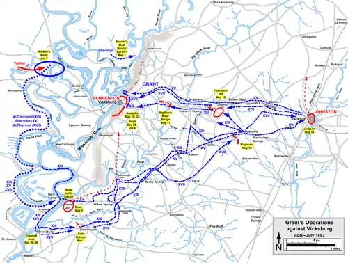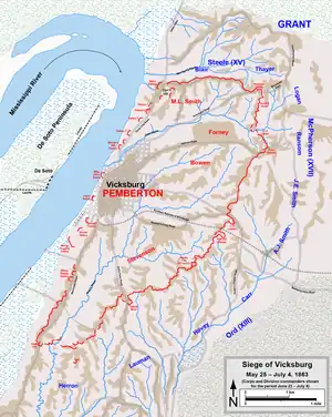 - Unionshæren nærmede sig Vicksburg og indesluttede Pembertons styrke. Grant forsøgte to angreb for at bryde gennem de stærke konfødererede skanser: den 19. og den 22. maj. Det sidste angreb havde nogen fremgang i starten i McClernands sektor, men blev slået tilbage med et tab på 3.200 mand. Johnston gav Pemberton ordre til at evakuere byen og redde sin hær, men Pemberton mente at det var umuligt at trække sig sikkert tilbage. Johnston planlagde at angribe Grant og undsætte Pemberton, men kunne ikke arrangere det i tide. Grant belejrede den konfødererede armé. Den 4. juli, efter seks uger hvor soldater og civile i Vicksburg var uden forsyninger og konstant udsat for artilleribeskydning, overgav Pemberton byen og sin hær.[17]