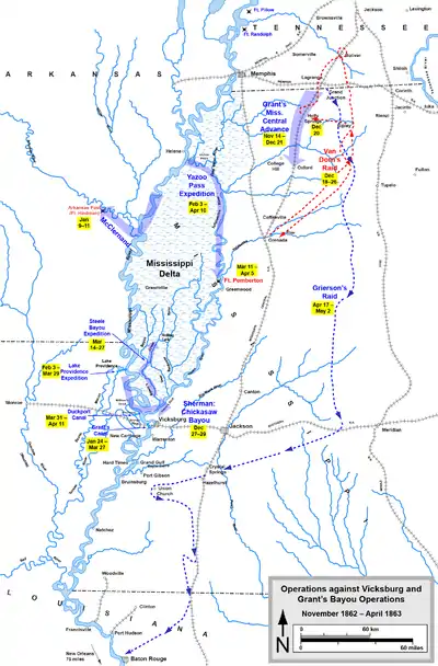 I løbet af vinteren gennemførte Grant en række initiativer for at nå frem til og erobre Vicksburg. Disse blev kaldt "Grants bayou-operationer". De gik ud på at skabe alternative vandveje, så tropper kunne placeres indenfor kort afstand af Vicksburg, uden at man behøvede at sejle direkte ned ad Mississippi mod de konfødererede kanoner.