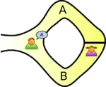 Først venter Victor uden for hulen, mens Peggy går ind. Vi navngiver de to stier fra indgange A og B for venstre henholdsvist højre. Hun tager tilfældigt indgang A eller B. Efter hun er gået ind af den ene indgang og står i den anden ende af hulen, går Victor ind. Han råber derefter navnet på den indgang, som Peggy skal komme ud af – enten A eller B helt tilfældigt valgt. Victor ved ikke hvilken sti, Peggy er gået ned af. Hvis Peggy er gået ned af sti A, og Victor råber A, så kan hun blot gå tilbage igen. Men hvis Victor råber B, så siger hun blot det hemmelige kodeord, går igennem døren og kommer ud af sti B. Tilsvarende, hvis hun var gået ind af B, kunne hun komme ud af begge stier. Derefter går Victor ud igen, Peggy vælger en sti, Victor kommer ind igen og råber navnet på den sti, hun skal komme ud af.