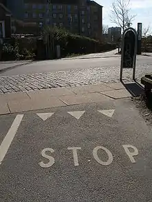 Vigelinje er ofte er ledsaget af den ligeledes trekantede færdelsestavle ubetinget vigepligt. Ubetinget vigepligt betyder, at man skal holde tilbage for trafik fra alle retninger.
