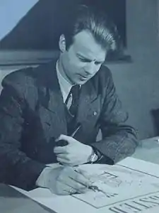 ![]() Viggo Guttorm-Pedersen på Teknisk Skole, hvor han underviste i skriftemaling | |