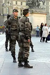 Logistiske tropper fra den franske hær på patrulje foran Louvre