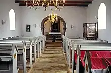 I vestpulpiturets felter ses en række fine malerier med bibelske motiver. På alterbordet, der blot består af fyrrepaneler, står altertavlen, der skildrer korsfæstelsen og er malet af Anton Dorph i 1895. Prædikestolen er fra 1626 og har allegoriske billeder af dyderne og våben for Jockum Poulsen og hustru. Døbefonten er af sandsten og er fra 1884. Den har et glat messingfad fra omkring 1700.