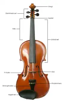 En almindelig violin består oftest af en topplade af gran (kaldet dækket), sider, bagplade, hals og hoved af ahorn. Oftest er en hagestøtte placeret lige over eller til venstre for strengeholderen. Den karakteristiske timeglasform giver plads til at buen kan vinkles. Halsen er normalt lavet af ahorn, som bagtil er ulakeret for at give mindre friktion når hånden bevæges, og fortil er hæftet på gribebrættet, som oftest er lavet af ibenholt. På billigere instrumenter er det lige så ofte en billigere type træ som er bejdset sort.