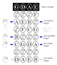 Fingrene er fortløbende nummereret; 1 (for pegefinger) til 4 (for lillefinger), 0 indikerer den løse streng. Hvad der ikke ses af skemaet til højre er forholdet mellem fingerplaceringerne, som bliver mindre jo længere man bevæger sig op ad halsen. De blå markeringer illustrerer placeringen af tape for begyndere.