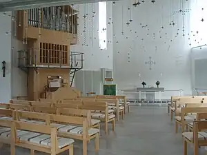 Der er ingen altertavle i tilknytning til alteret. I stedet er den 12 meter høje, vinduesløse, østvendte altervæg udsmykket med en svag reliefmuring, der forestiller et livstræ, som søger op og ud imod det lys, som strømmer ind ad det store syd-østvendte vindue. På væggen er der malet et antal felter med en lyseblå farve, som skal illudere himmel, og på en skyfri dag vil beskueren opdage, at farven matcher den rigtige himmel, som ses gennem det syd-østvendte vindue, utroligt godt.