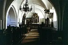 Ved ombygningen i 1593 fik kirkerummet indbygget hvælv. Prædikestolen er fra år 1600 og har våben for Sophie Bille samt andre. I kirken ses stolegavle fra 1570 med våben for Johanne Nielsdatter Rotfeld, Havnø samt fra 1574 og 1586 med våben for Jakob Seefeld og hustruer, desuden ses gavle fra 1636. Kirkeskibet Hendrik Harren er fra midten af 1800-tallet.