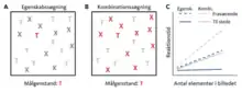 I modsætning til egenskabssøgning er der ved kombinationssøgning tale om distraktioner med mere end én egenskab tilfælles med målgenstanden. Her har de grå X’er fra tidligere altså fået tildelt samme farve som målgenstanden, og dermed deler begge halvdelen hver især én egenskab med målgenstan-den. Det bliver dermed sværere at skelne mellem distraktionerne og målgenstanden, fordi der ikke længere er den ene egenskab, der gør, at målgenstanden skiller sig ud. På figur C ses det, at reaktions-tiden, når målgenstanden er til stede (grå graf), stiger afhængigt af distraktionerne. Ydermere kan det ses af figur C, at hvis målgenstanden ikke er til stede (stiplet grå graf), så vil individet, som nævnt tidligere, have en tendens til at lede efter det røde T og til sidst erkende, at det ikke er der. [2]